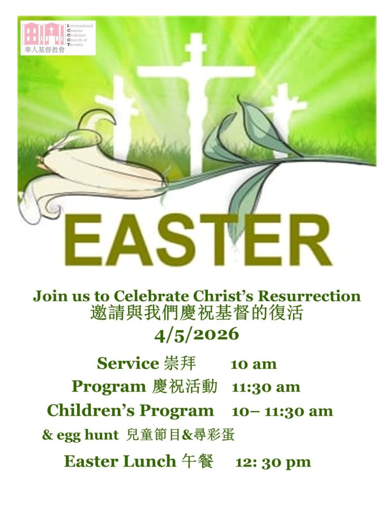 請於4月5日與我們一同慶祝復活節,紀念耶穌基督的復活。禮拜將於上午10點開始。慶祝活動(包括戲劇和音樂表演)將於上午11點30分舉行。午餐將於下午12點30分開始。