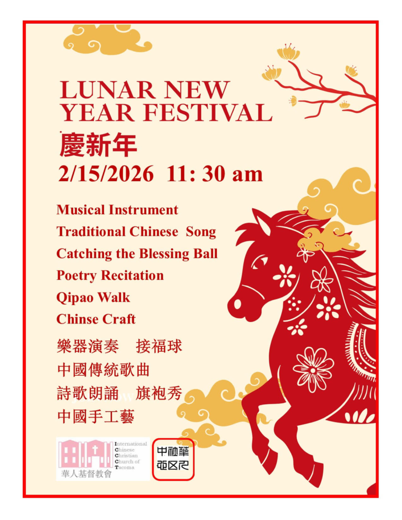 Please celebrate the Chinese New Year with us on Sunday, 2/15/26, at 11:30 am. There will be musical instruments, traditional Chinese songs, catching the blessing Ball, poetry recitation, qipao Walk, and Chinese crafts.