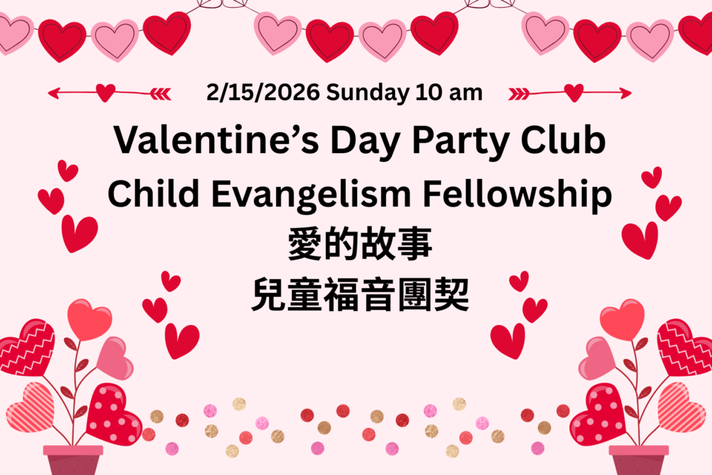兒童福音團契將於2月15日(星期日)上午10點在我們的兒童主日學上分享上帝愛的故事。請帶您的孩子和您朋友的孩子來參加,一起學習和玩耍!